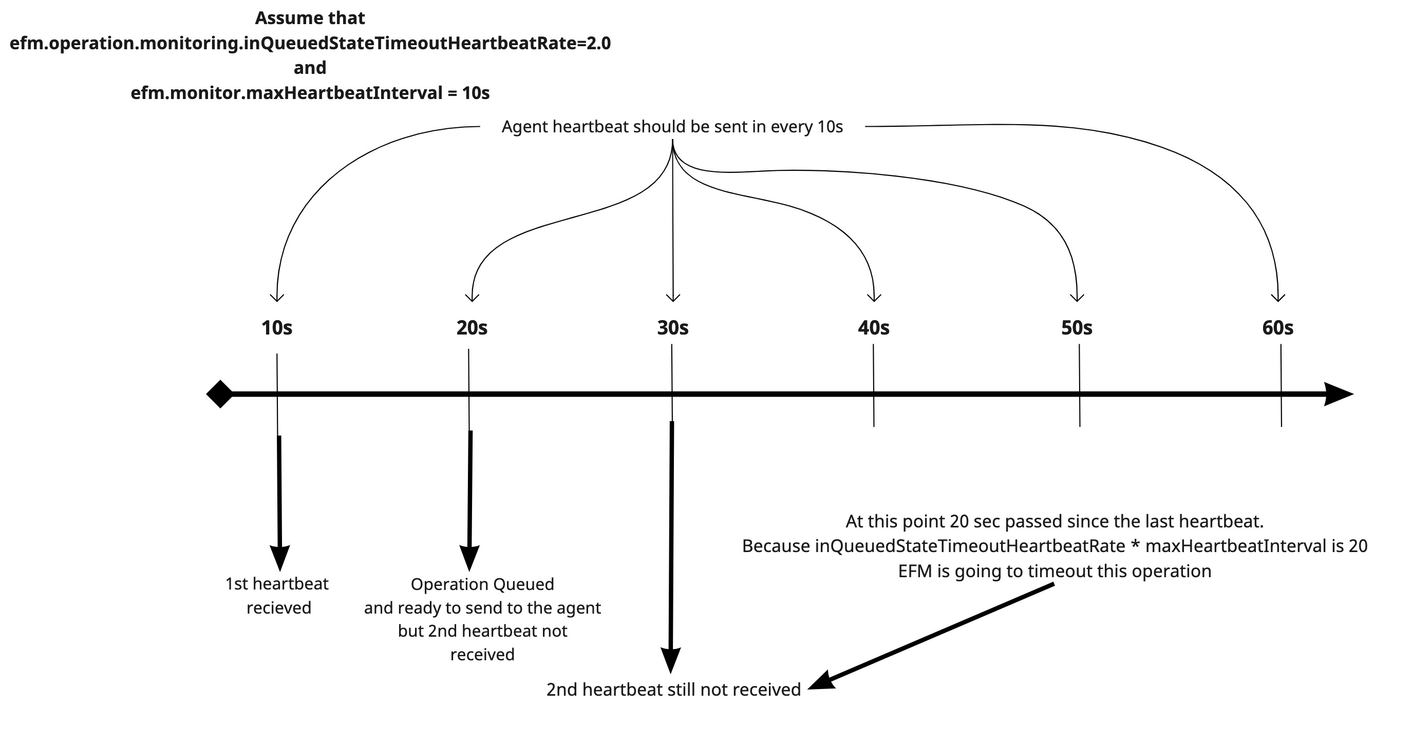 efm.monitor.maxHeartbeatInterval=10sandefm.operation.monitoring.inQueuedStateTimeoutHeartbeatRate=2.0.The following chart shows you how this situation looks like on a timeline: