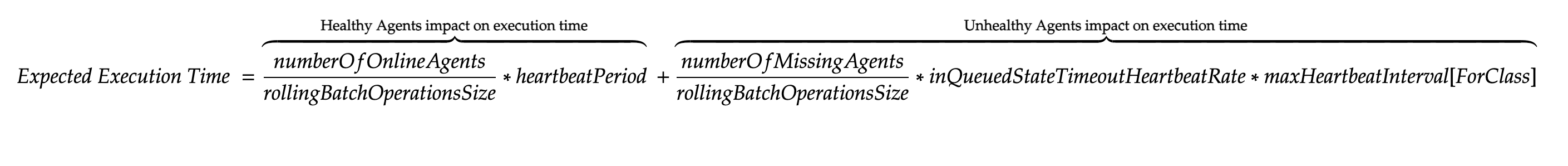 efm.operation.monitoring.rollingBatchOperationsSize: Set to 10-20% of the total number of agents; but it should not exceed 1000.efm.operation.monitoring.rollingBatchOperationsFrequency: Based on former execution times, find the frequency where at most 25% of the rolling batch size frees up in a single iteration.efm.monitor.maxHeartbeatIntervalin combination withefm.operation.monitoring.inQueuedStateTimeoutHeartbeatRate: Maxheartbeatrate should be close to 75 percentile so you can keepinQueuedStateTimeoutHeartbeatRateto a value which should not be more than 3. If a higher number is needed for the rate, you should investigate those agents why those agents do not match with criterias.efm.operation.monitoring.inDeployedStateTimeoutin combination withefm.operation.monitoring.inDeployedStateCheckFrequency: Deployed state timeout should be 120% of the longest expected operation execution time. State check frequency should be set to such a value where EFM checks state at most 4-10 times during the operation execution.- If you put together all the configurations explained in the scenarios, you can get an