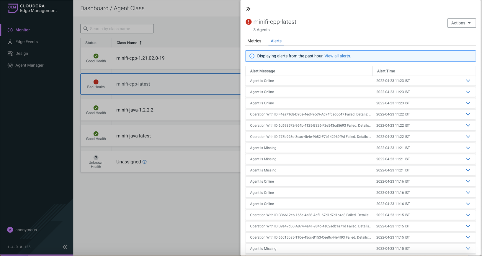 The Alerts tab displays the alert messages associated with the agent class.