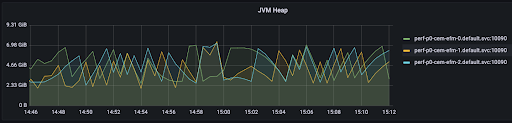 The heap consumption fluctuates between 2.3 GB and 7.5 GB with maximum Garbage Collection (GC)
