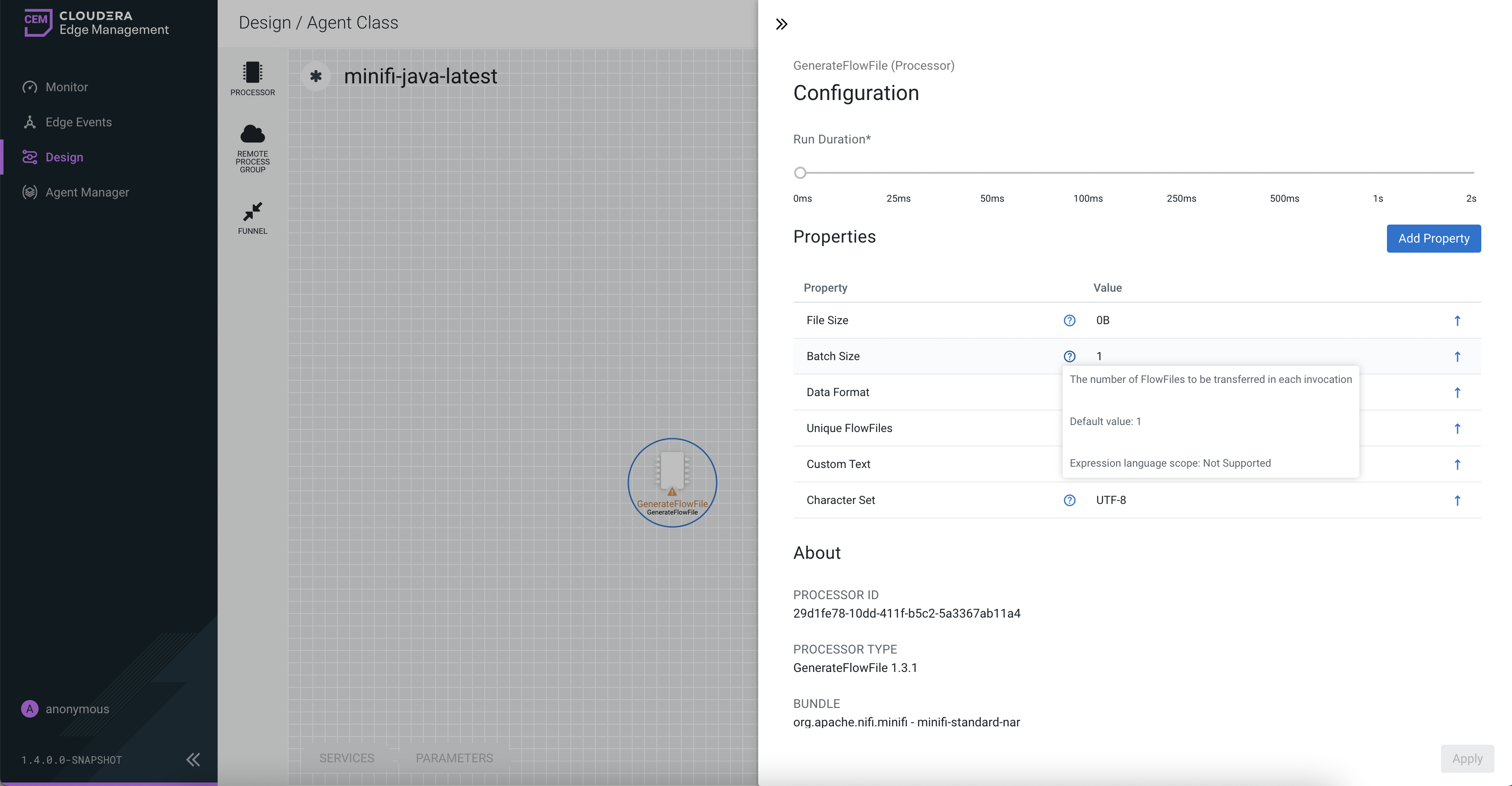 properties make sense for its use case.A GenerateFlowFile processor, by default, has four properties including Batch Size, Data Format, File Size, and Unique FlowFiles. Next to the name of each property, there appears a small question-mark symbol (