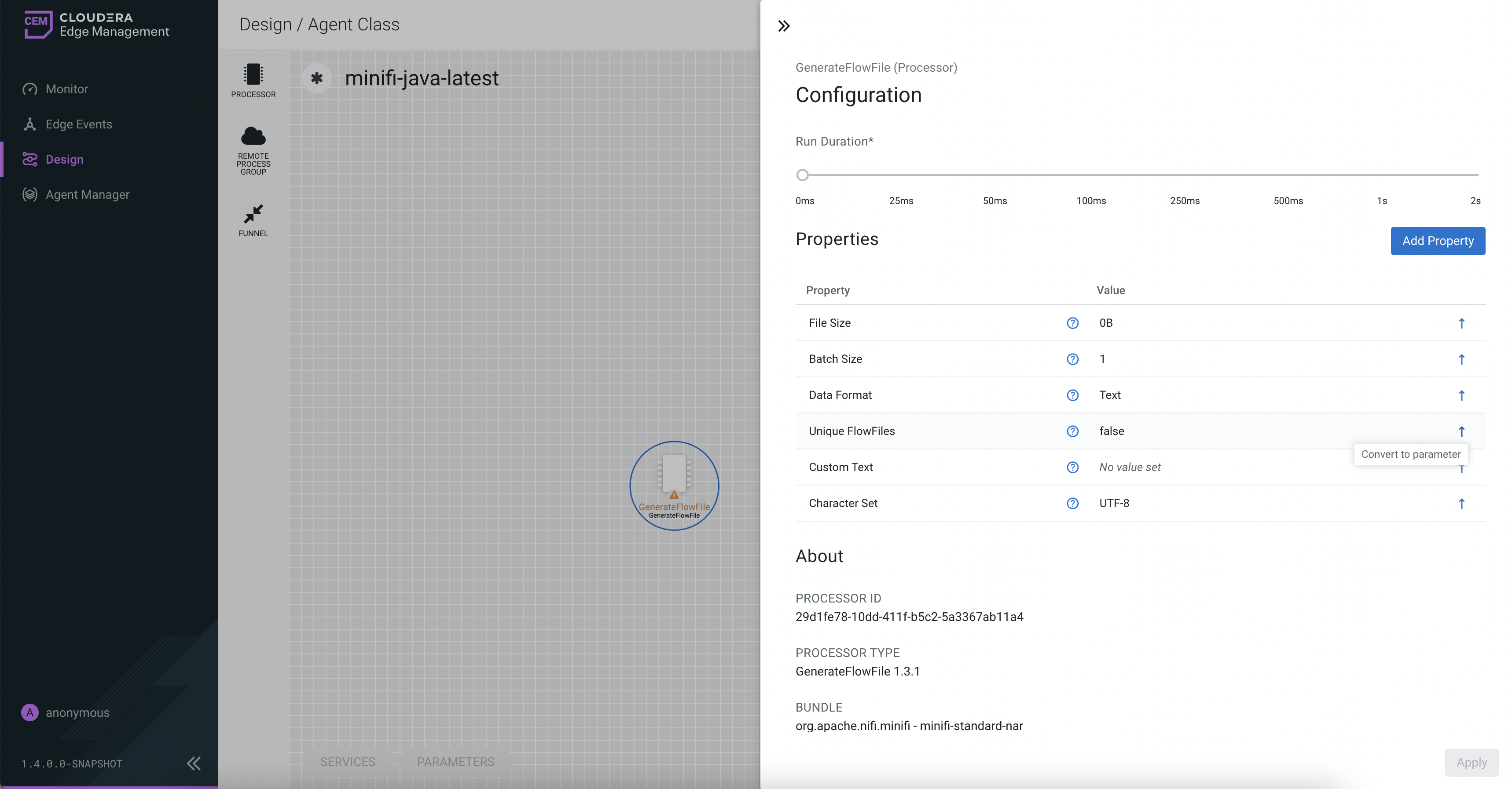 Each of the properties has an arrow in the row showing that they can be converted to parameters. The following image shows the Convert to parameter option for the Unique FlowFiles property: