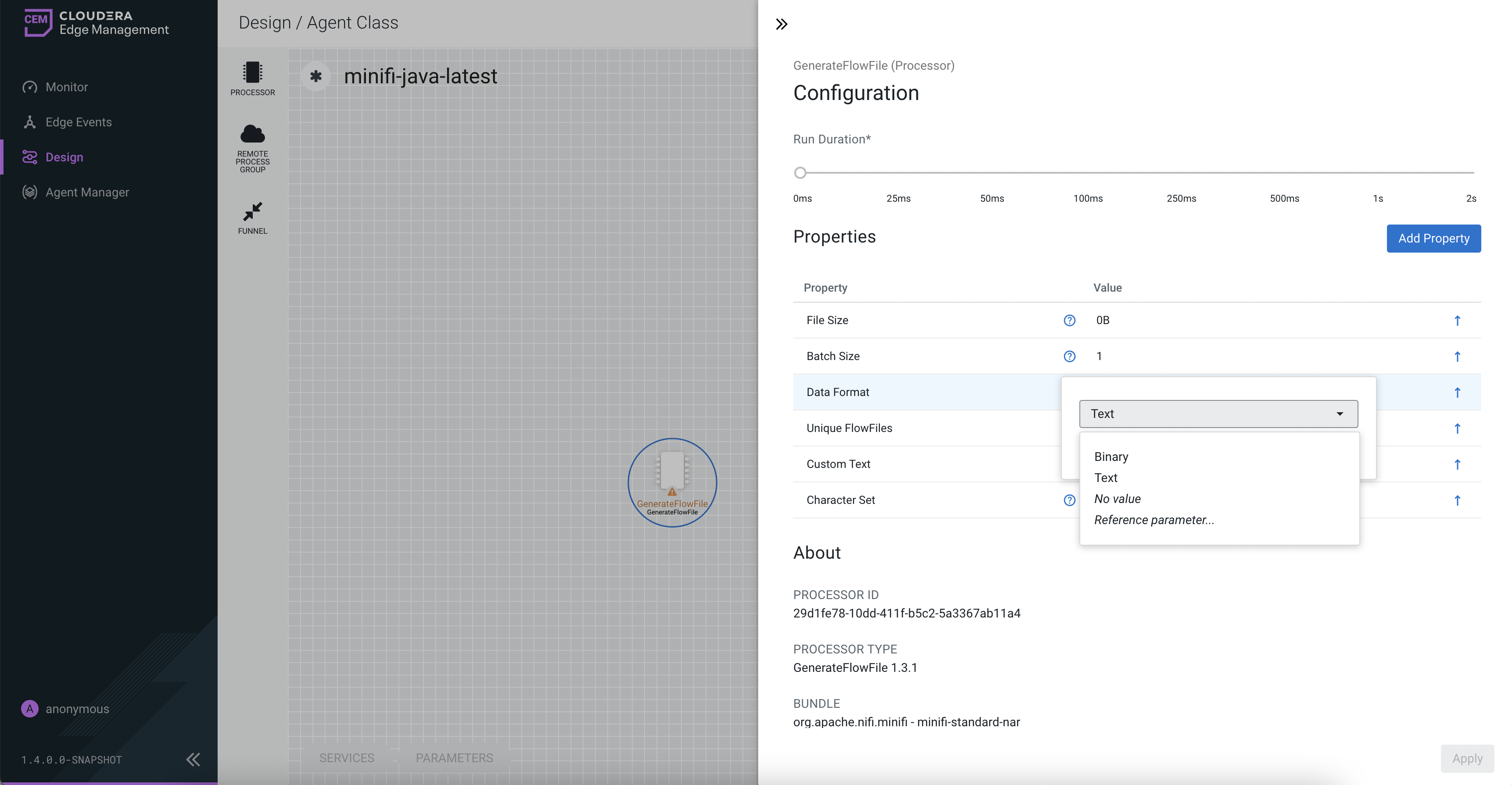 Clicking on the value for the property allows you to change the value. Depending on the values that are allowed for the property, you are either provided a drop-down from which to choose a value, or a text area to type a value. Here is an example of GenerateFlowFile processor with the drop-down for the Data Format property: