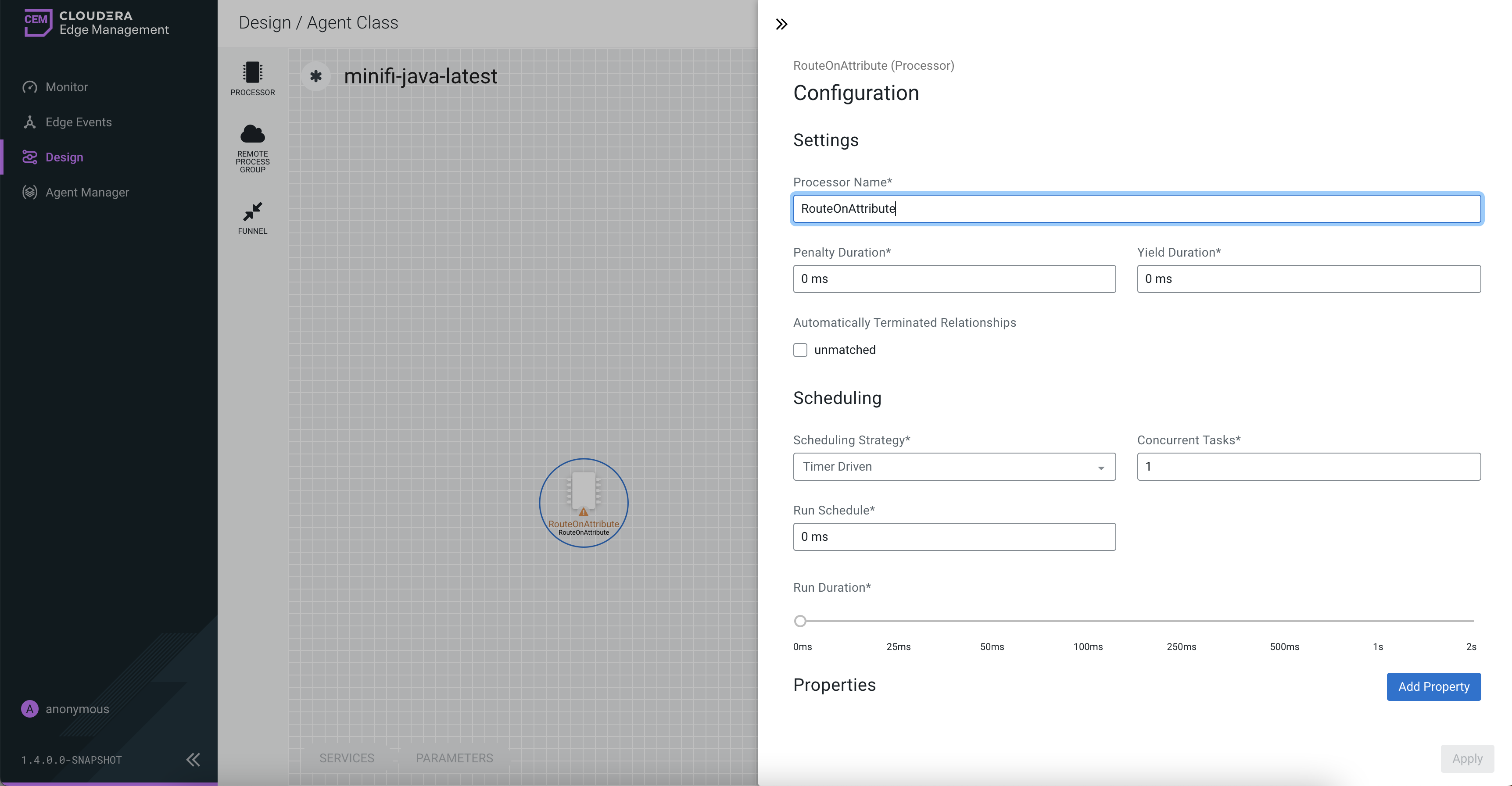 For some processors, there appears an Add Property button, beside the Properties section, for adding a user-defined property. When you click this button, a dialog opens, which allows you to enter the name and value of a new property. Not all processors allow user-defined properties. The RouteOnAttribute processor, however, allows user-defined properties. In fact, this Processor will not be valid until you add a property. The following image shows the Add Property button in the Configuration dialog of the RouteOnAttribute processor: