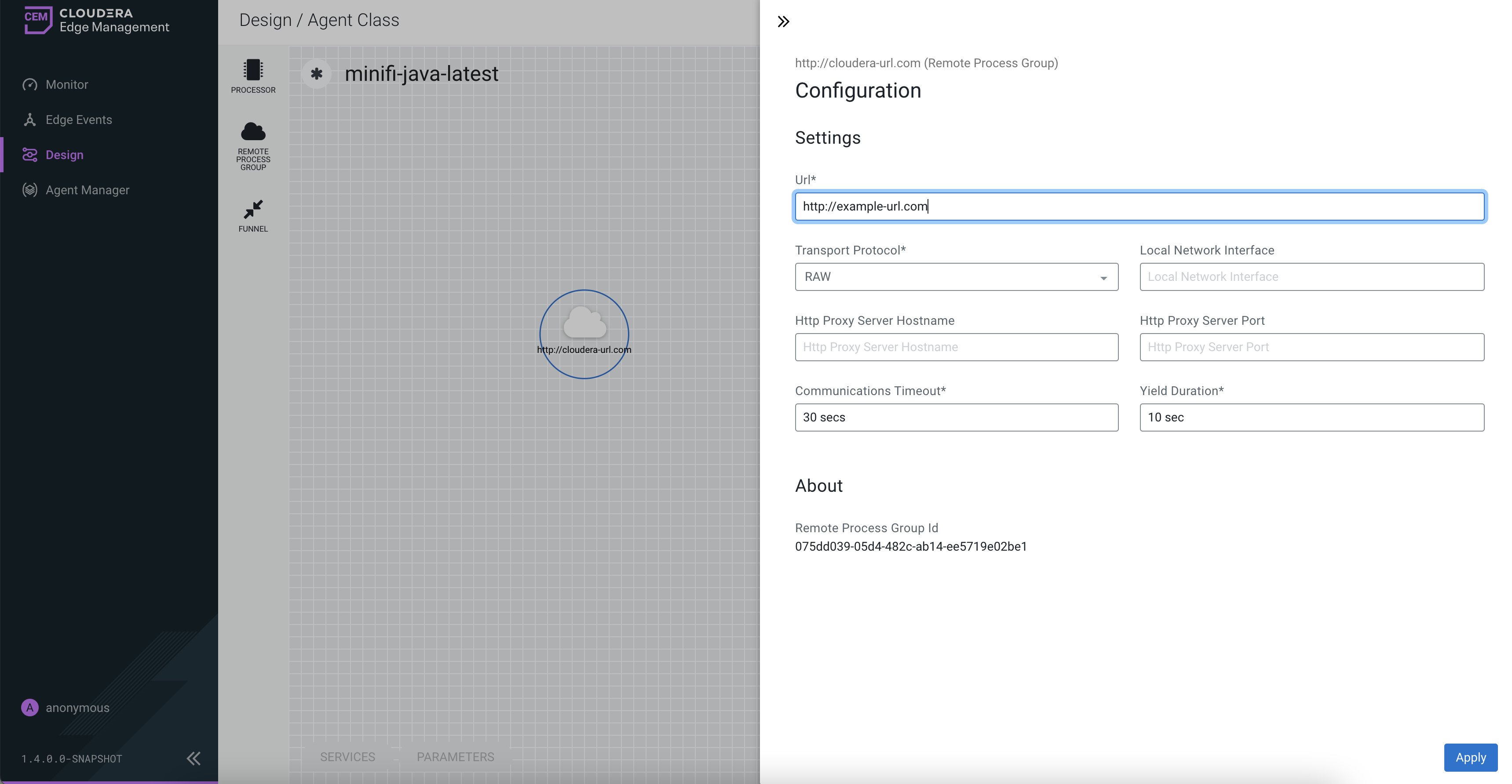 Learn how to configure a remote process group using the Cloudera Edge Management (CEM) UI.