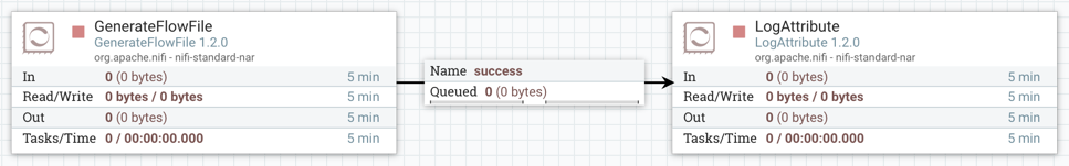 This section has described the steps required to build a dataflow. Now, to put it all together. The following example dataflow consists of just two processors: GenerateFlowFile and LogAttribute. These processors are normally used for testing, but they can also be used to build a quick flow for demonstration purposes and see NiFi in action.