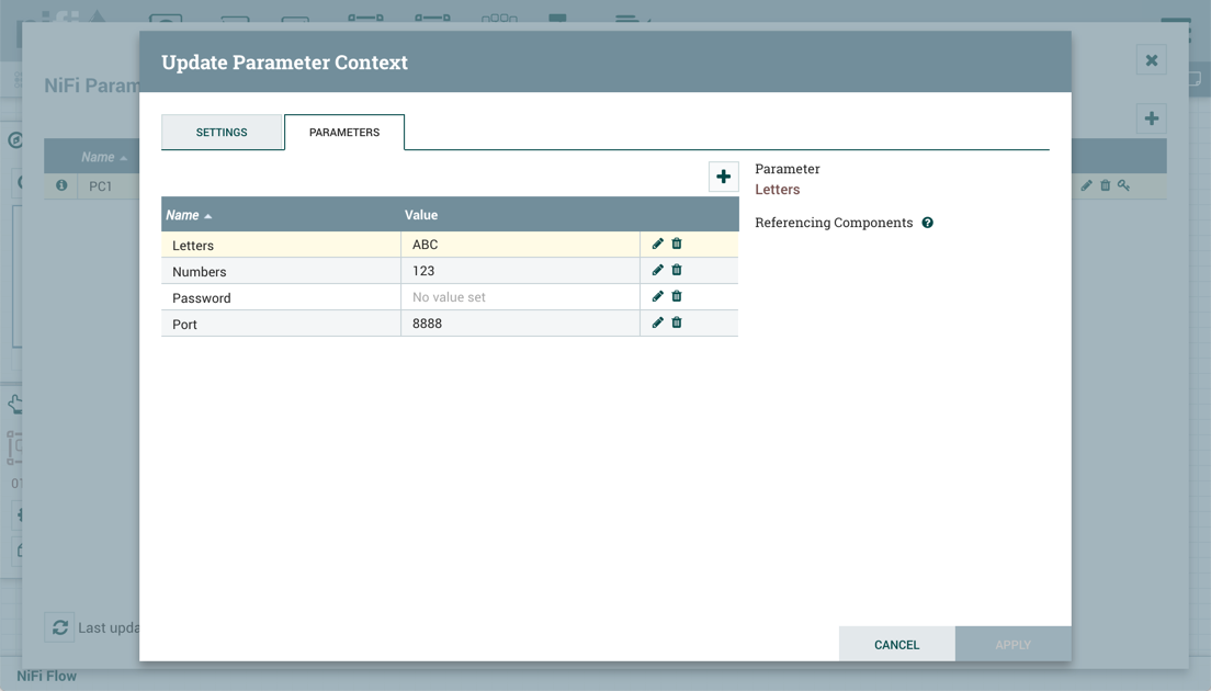 A flow has a Parameter Context "PC1" with the following parameters:
