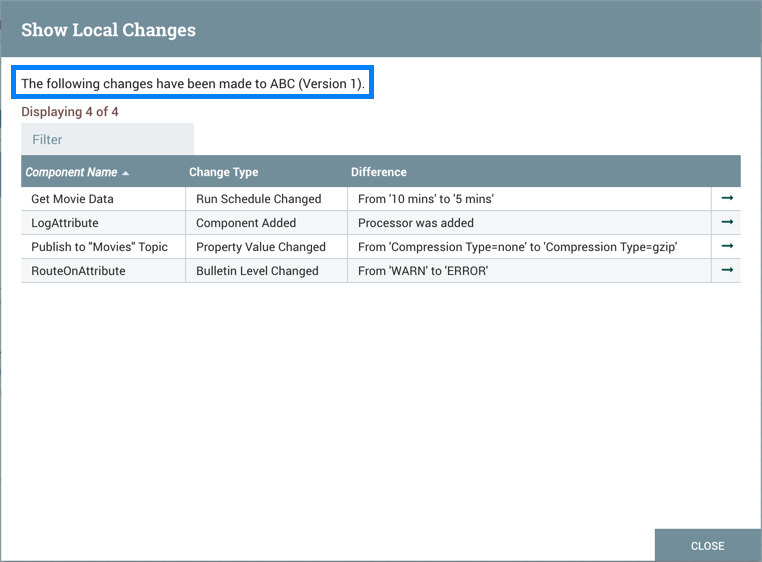 The local changes made to a versioned process group can be viewed in the Show Local Changes dialog by selecting "Version→Show local changes" from the context menu.