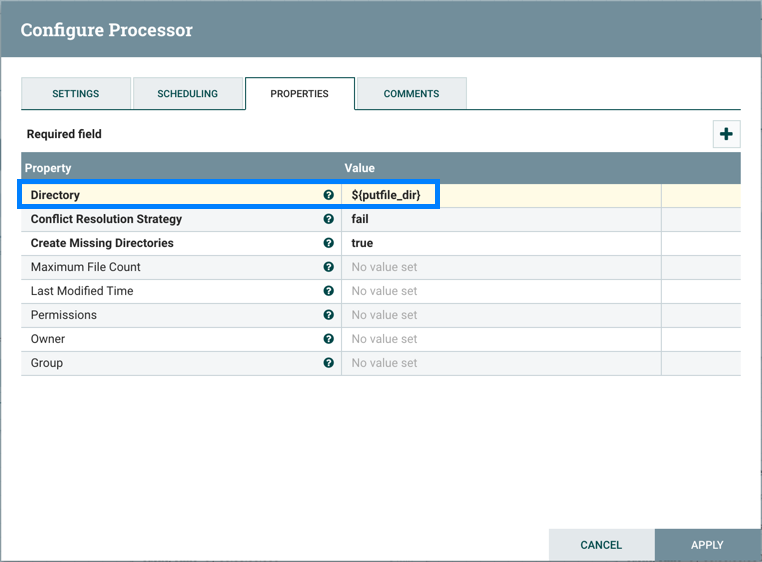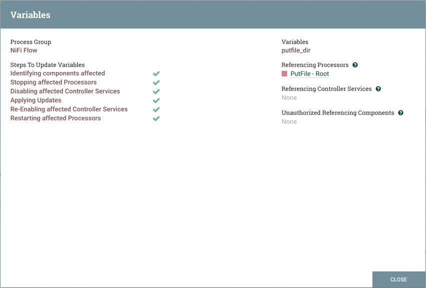 Steps to update the variable are performed (Identifying components affected, Stopping affected Processors, etc.). For example, the Referencing Processors section now lists the "PutFile-Root" processor. Selecting the name of the processor in the list will navigate to that processor on the canvas. Looking at the properties of the processor, ${putfile_dir} is referenced by the Directory property: