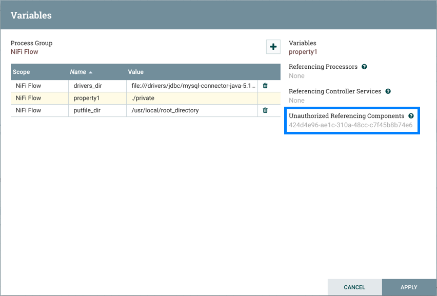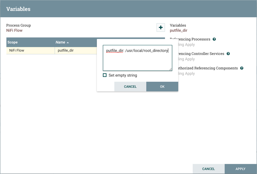 For example, in addition to the putfile_dir variable that exists at the root process group, assume another putfile_dir variable was created within Process Group A. If one of the components within Process Group A references putfile_dir, both variables will be listed, but the putfile_dir from the root group will have a strikethrough indicating that is is being overridden: