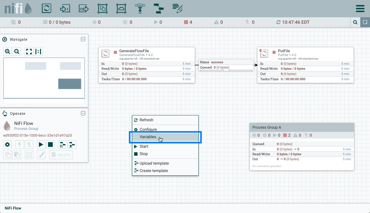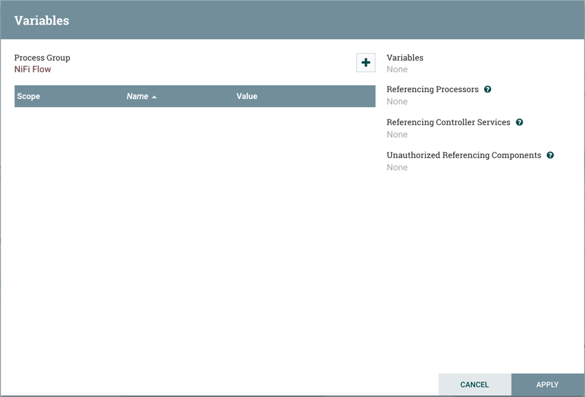 Variables are created and configured within the NiFi UI. They can be used in any field that supports Expression Language. Variables cannot be used for sensitive properties. Variables are defined at the Process Group level, as a result, the access policies for viewing and changing variables are derived from the access policies of the Process Group. Variable values cannot reference other variables or make use of Expression Language.