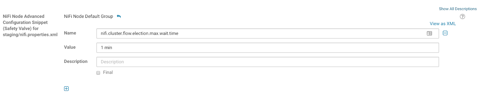 The NiFi Section for default values can be overridden using safety valves. These can be pasted in as needed using the View as XML link for nifi.properties.xml safety valve. See the NiFi Documentation for available property values and usages.