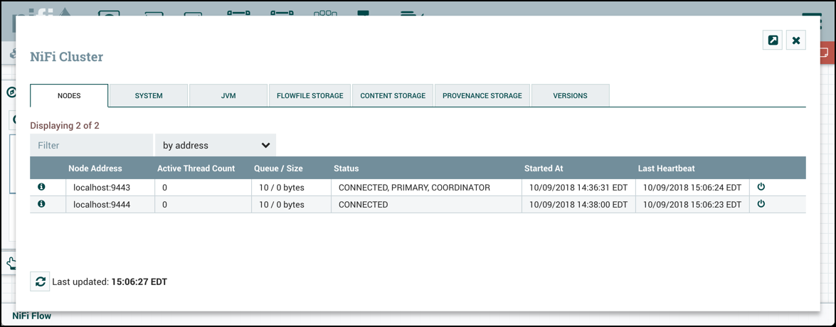 Primary Node: Every cluster has one Primary Node. On this node, it is possible to run "Isolated Processors" (see below). ZooKeeper is used to automatically elect a Primary Node. If that node disconnects from the cluster for any reason, a new Primary Node will automatically be elected. Users can determine which node is currently elected as the Primary Node by looking at the Cluster Management page of the User Interface.