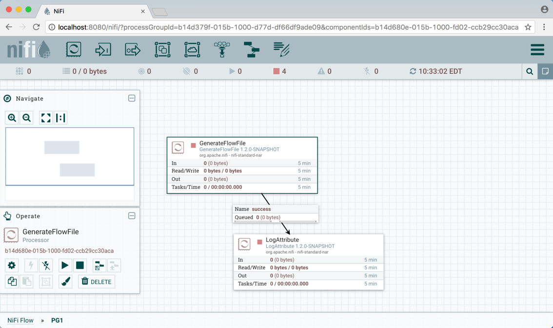 In the following screenshot, the GenerateFlowFile processor in the process group PG1 is the selected component:
