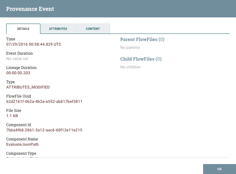 The Details tab shows various details about the event, such as when it occurred, what type of event it was, and the component that produced the event. The information that is displayed will vary according to the event type. This tab also shows information about the FlowFile that was processed. In addition to the FlowFile's UUID, which is displayed on the left side of the Details tab, the UUIDs of any parent or children FlowFiles that are related to that FlowFile are displayed on the right side of the Details tab.
