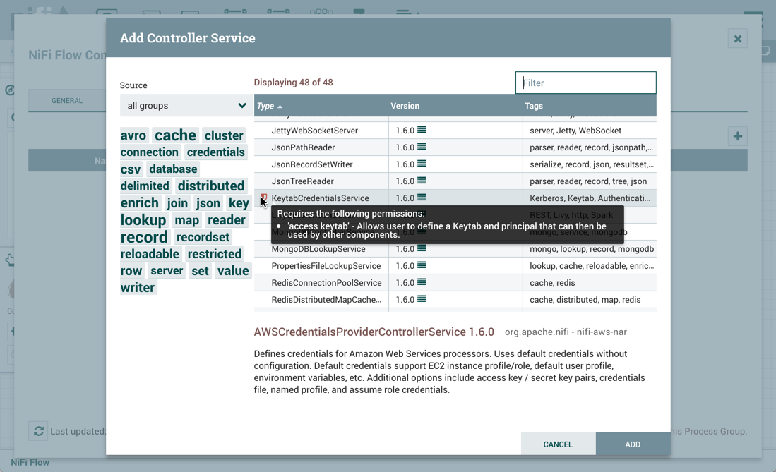 KeytabCredentialService controller service is a restricted component that requires 'access keytab' permissions: