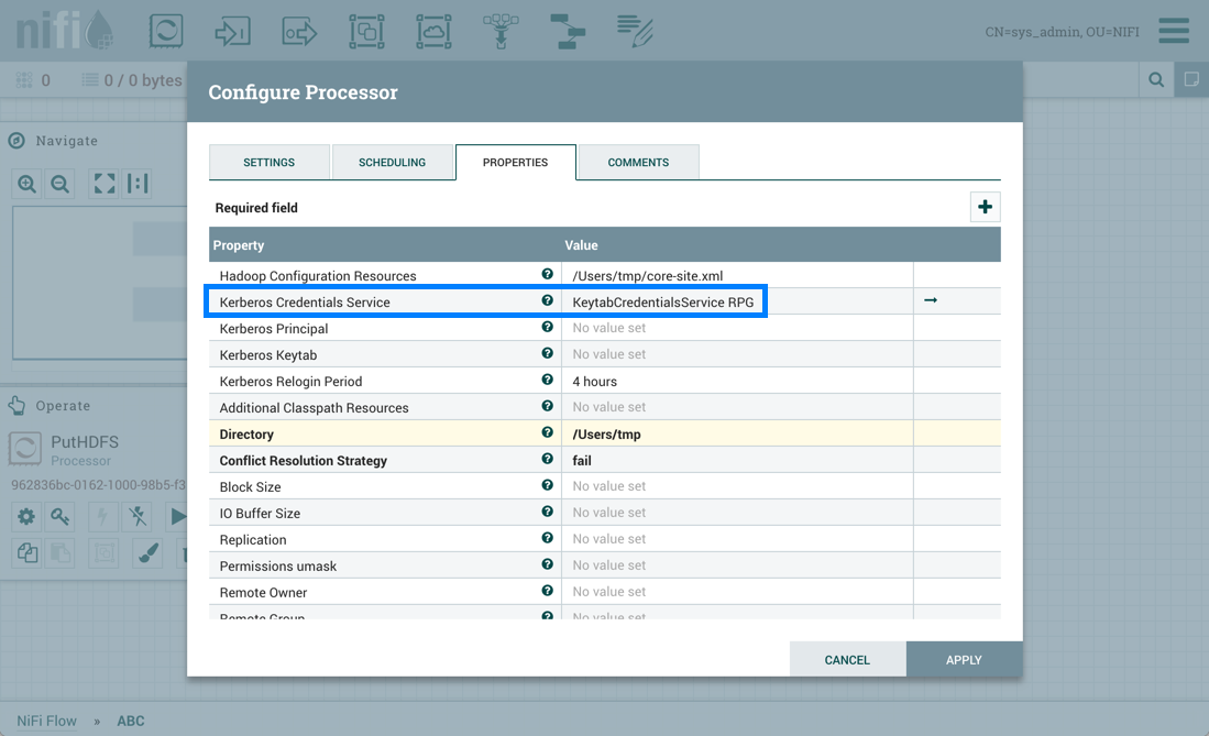 The PutHDFS processor is configured to use the root process group level KeytabCredentialsService controller service: