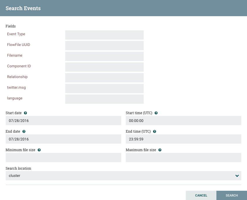 One of the most common tasks performed in the Data Provenance page is a search for a given FlowFile to determine what happened to it. To do this, click the "Search" button in the upper-right corner of the Data Provenance page. This opens a dialog window with parameters that the user can define for the search. The parameters include the processing event of interest, distinguishing characteristics about the FlowFile or the component that produced the event, the timeframe within which to search, and the size of the FlowFile.