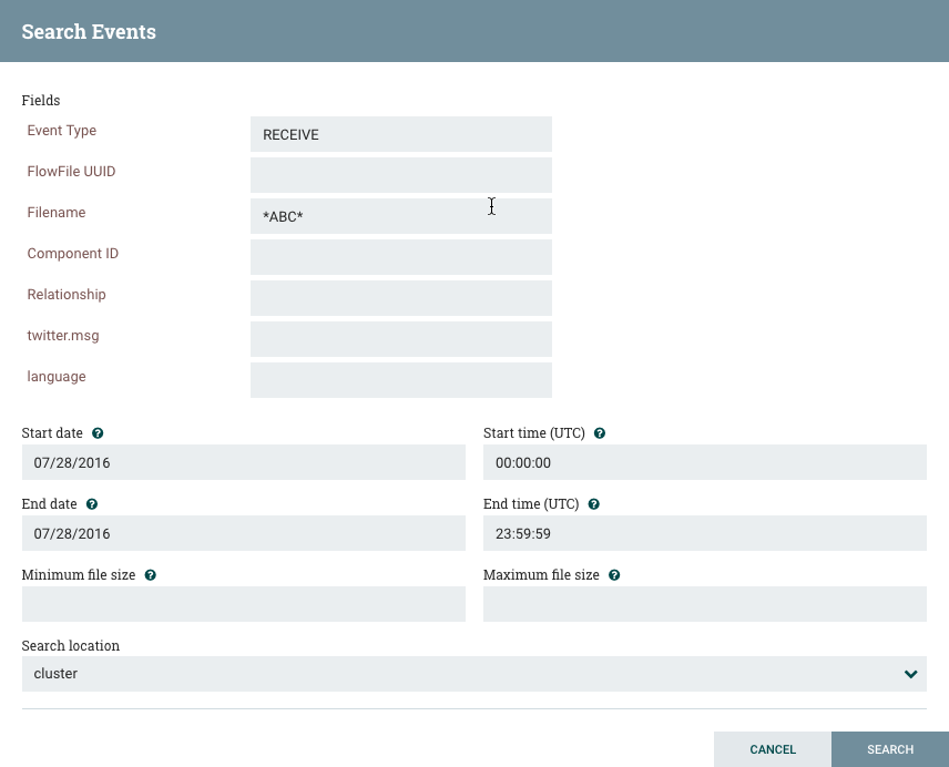 For example, to determine if a particular FlowFile was received, search for an Event Type of "RECEIVE" and include an identifier for the FlowFile, such as its uuid or filename. The asterisk (*) may be used as a wildcard for any number of characters. So, to determine whether a FlowFile with "ABC" anywhere in its filename was received at any time on Jan. 6, 2015, the search shown in the following image could be performed: