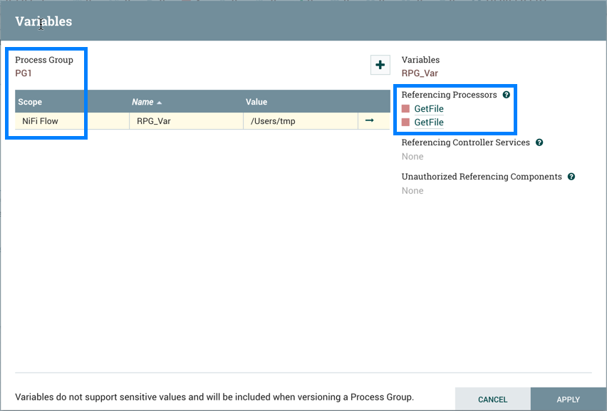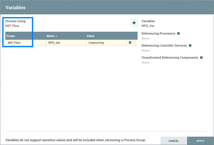Variables are included when a process group is placed under version control. If a versioned flow is imported that references a variable not defined in the versioned process group, the reference is maintained if the variable exists. If the referenced variable does not exist, a copy of the variable will be defined in the process group. To illustrate, assume the variable "RPG_Var" is defined in the root process group: