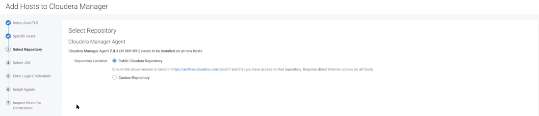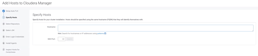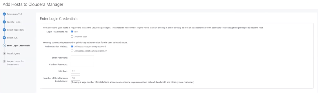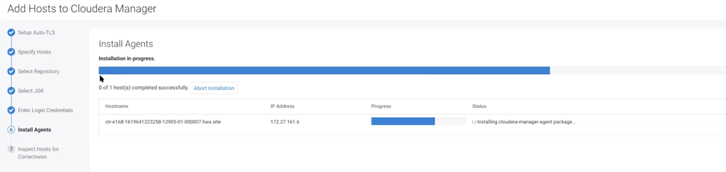 for host in $(echo \ ccycloud-1.am2cmhdf.root.hwx.site \ ccycloud-2.am2cmhdf.root.hwx.site \ ccycloud-3.am2cmhdf.root.hwx.site \ ccycloud-4.am2cmhdf.root.hwx.site \ ); do ssh $host "sed -i "s/server_host=localhost/server_host=ccycloud-1.am2cmhdf.root.hwx.site/" /etc/cloudera-scm-agent/config.ini ";done for host in $(echo \ ccycloud-1.am2cmhdf.root.hwx.site \ ccycloud-2.am2cmhdf.root.hwx.site \ ccycloud-3.am2cmhdf.root.hwx.site \ ccycloud-4.am2cmhdf.root.hwx.site \ ); do ssh $host "systemctl restart cloudera-scm-agent";done for host in $(echo \ ccycloud-1.am2cmhdf.root.hwx.site \ ccycloud-2.am2cmhdf.root.hwx.site \ ccycloud-3.am2cmhdf.root.hwx.site \ ccycloud-4.am2cmhdf.root.hwx.site \ ); do ssh $host "systemctl status cloudera-scm-agent";done - To manually configure agents and hosts, perform the following steps: