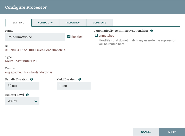 The right-hand side of the Settings tab contains an 'Automatically Terminate Relationships' section. Each of the Relationships that is defined by the Processor is listed here, along with its description. In order for a Processor to be considered valid and able to run, each Relationship defined by the Processor must be either connected to a downstream component or auto-terminated. If a Relationship is auto-terminated, any FlowFile that is routed to that Relationship will be removed from the flow and its processing considered complete. Any Relationship that is already connected to a downstream component cannot be auto-terminated. The Relationship must first be removed from any Connection that uses it. Additionally, for any Relationship that is selected to be auto-terminated, the auto-termination status will be cleared (turned off) if the Relationship is added to a Connection.