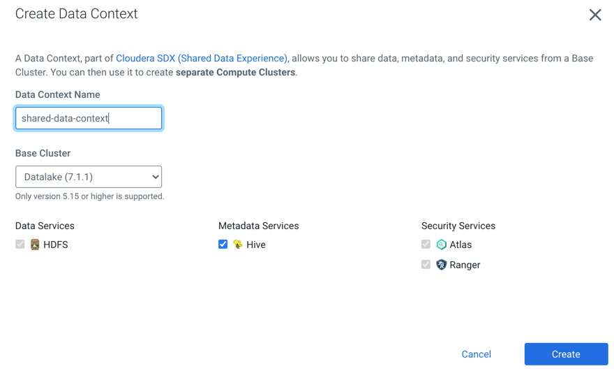 - In the Create Data Context dialog, provide a Data Context Name, specify your Base cluster, and click Create.
