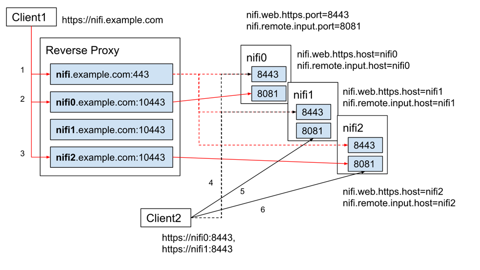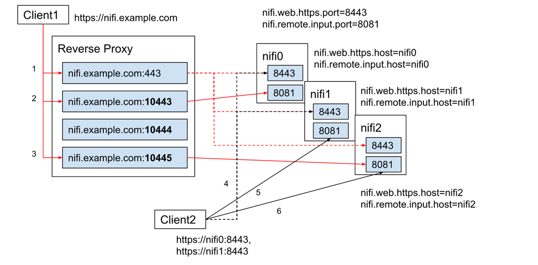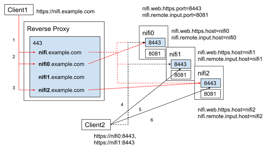 Client1 in the following diagrams represents a client that does not have direct access to NiFi nodes, and it accesses through the reverse proxy, while Client2 has direct access.