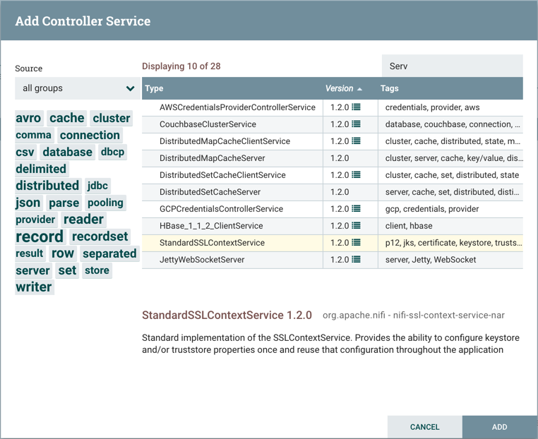 The Add Controller Service window opens. This window is similar to the Add Processor window. It provides a list of the available Controller Services on the right and a tag cloud, showing the most common category tags used for Controller Services, on the left. The DFM may click any tag in the tag cloud in order to narrow down the list of Controller Services to those that fit the categories desired. The DFM may also use the Filter field at the top-right of the window to search for the desired Controller Service or use the Source drop-down at the top-left to filter the list by the group who created them. Upon selecting a Controller Service from the list, the DFM can see a description of the service below. Select the desired controller service and click Add, or simply double-click the name of the service to add it.