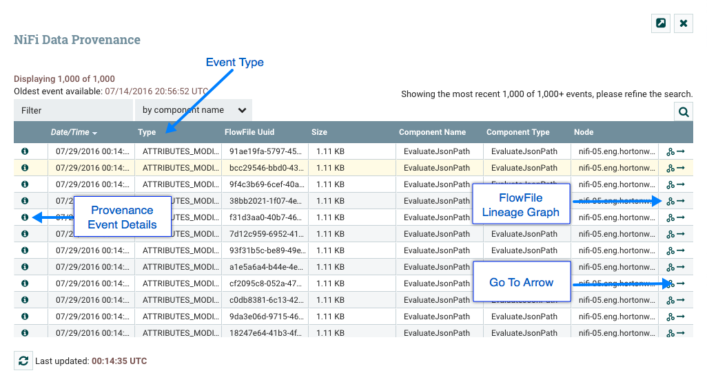 To access the Data Provenance page, select "Data Provenance" from the Global Menu. This opens a dialog window that allows the user to see the most recent Data Provenance information available, search the information for specific items, and filter the search results. It is also possible to open additional dialog windows to see event details, replay data at any point within the dataflow, and see a graphical representation of the data's lineage, or path through the flow. (These features are described in depth below.)