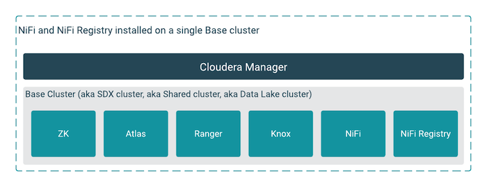 Installing NiFi on your Base cluster is a simplified deployment during which you create only one cluster. You can do this if you are deploying one cluster in trial deployments or in simple production scenarios.