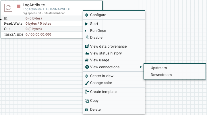 View connections→Upstream: This option allows the user to see and "jump to" upstream connections that are coming into the Processor. This is particularly useful when processors connect into and out of other Process Groups.