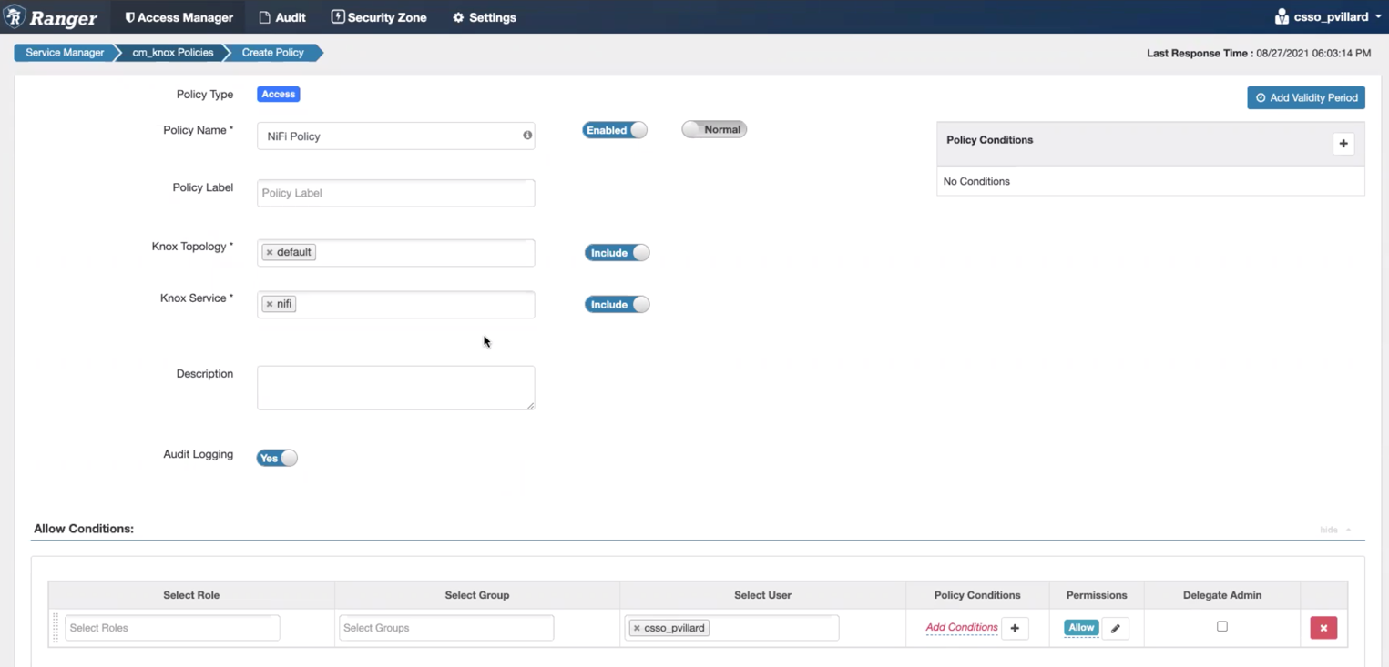 When NiFi is set up behind Knox, you need to define a Ranger policy that allows users
