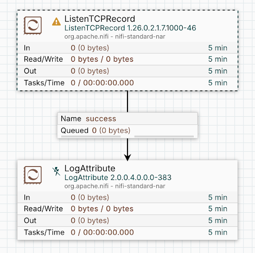 { "sequence" : 6, "type" : "manual-change-request", "subject" : "b41966ad-0194-1000-a08d-a92489457356", "message" : "The component has been deprecated. It is suggested to replace it with a combination of [org.apache.nifi.processors.standard.ListenTCP] and [org.apache.nifi.processors.standard.ConvertRecord] processors", "context" : { "rule" : "36227b60-75f0-40dc-8caf-a2ec577aa54c" }To identify the processor affected by these changes, search for the value of the “subject” element in NiFi’s search box. It refers to the ListenTCPRecord processor. Open the TCP Listener process group. You can see that the processor is marked with dashed borders and its version number still shows that of the NiFi 1 instance. It means that it is a "ghost processor", not available in NiFi 2. The log message suggests replacing it with a combination of ListenTCP and ConvertRecord processors.