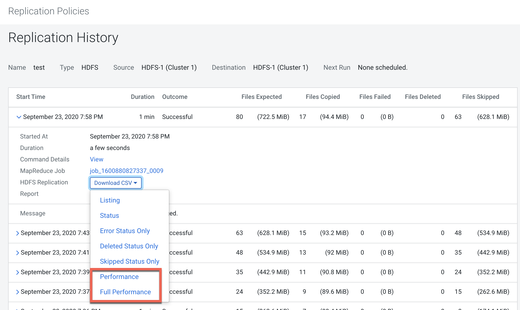 You can monitor the progress of an HDFS replication policy using performance data that you download as a CSV file from the Cloudera Manager Admin console.