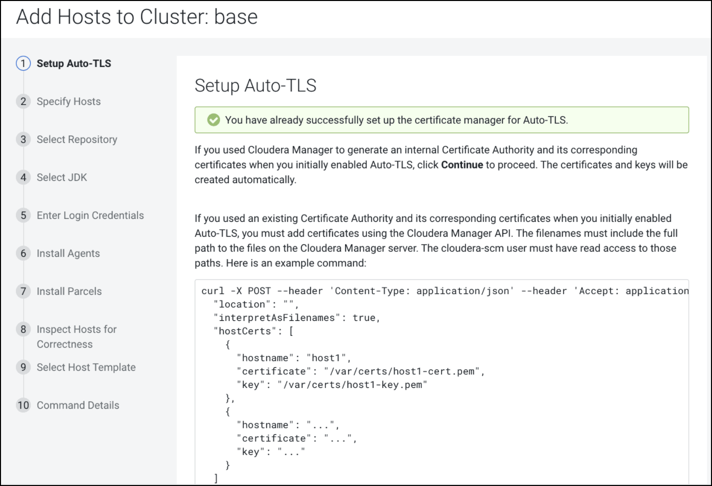curl -uadmin:admin -X POST --header 'Content-Type: application/json' --header 'Accept: application/json' -d '{ "location": "/opt/cloudera/AutoTLS", "interpretAsFilenames": true, "hostCerts": [ { "hostname": "ccycloud-10.vcdp71.root.hwx.site", "Certificate": "/tmp/auto-tls/certs/ccycloud-10.vcdp71.root.hwx.site.pem", "Key": "/tmp/auto-tls/certs/ccycloud-10.vcdp71.root.hwx.site.pemm" } ] }' 'https://ccycloud-7.vcdp71.root.hwx.site:7183/api/v41/cm/commands/addCustomCerts' - Continue to add hosts.