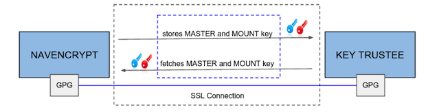 The master key is encrypted with a local GPG key. Before being stored in the Key Trustee Server database, it is encrypted again with the Key Trustee Server GPG key. When the master key is needed to perform a Navigator Encrypt operation, Key Trustee Server decrypts the stored key with its server GPG key and sends it back to the client (in this case, Navigator Encrypt), which decrypts the deposit with the local GPG key.