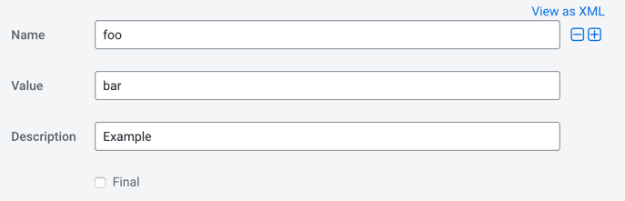 - XML EditorClick the View as XML link to view and edit the XML directly. Enter the property name, value, and optional description as XML elements. To indicate that the property value cannot be overridden, specify