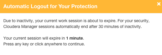 For security purposes, Cloudera Manager automatically logs out a user session after 30 minutes. You can change this session logout period.