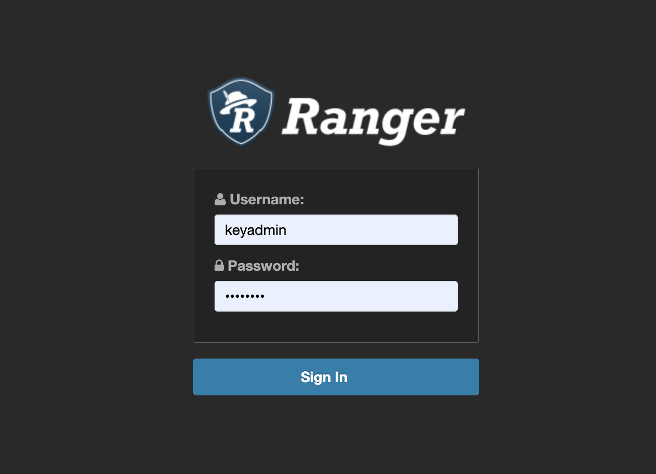To access Ranger KMS, click the Ranger Admin web UI link, enter your Ranger KMS admin user name and password, then click Sign In.