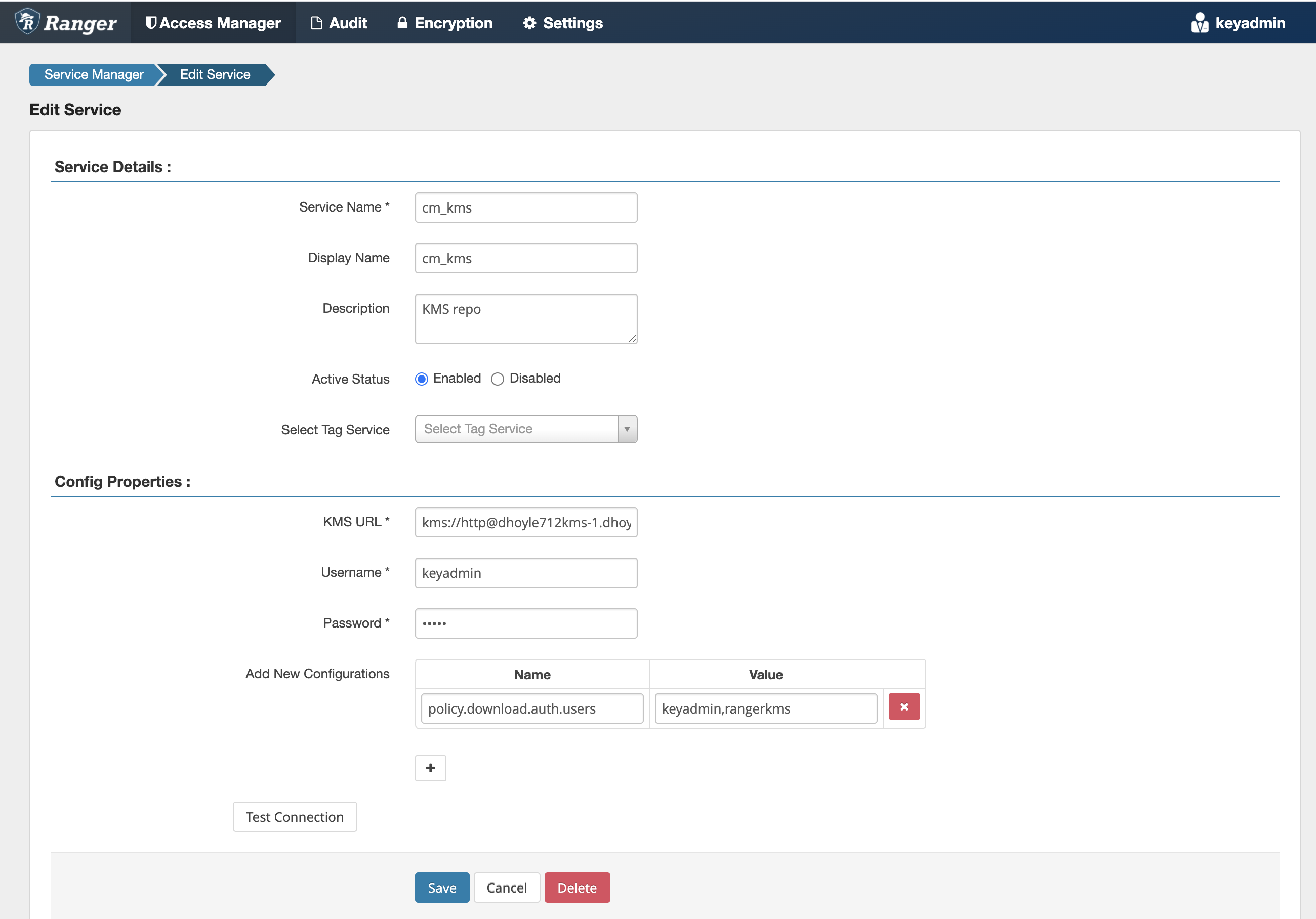 To edit Ranger KMS repository properties, click the Edit icon for the service and update the settings on the Edit Service page.