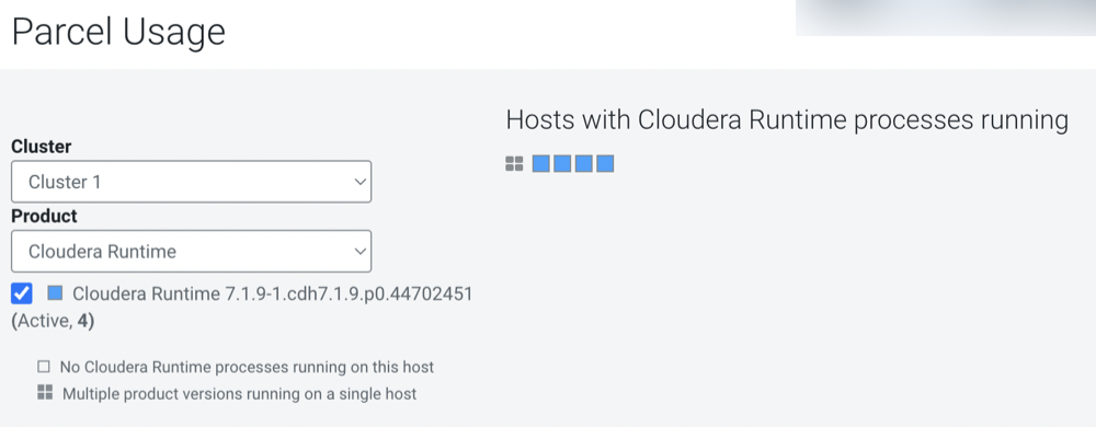 The host map at the right shows each host in the cluster, with the status of the parcels on that host. If the host is running the processes from the currently activated parcels, the host is indicated in blue. A black square indicates that a parcel has been activated, but that all the running processes are from an earlier version of the software. This occurs, for example, if you have not restarted a service or role after activating a new parcel. If you have individual hosts running components installed as packages, the square is empty.