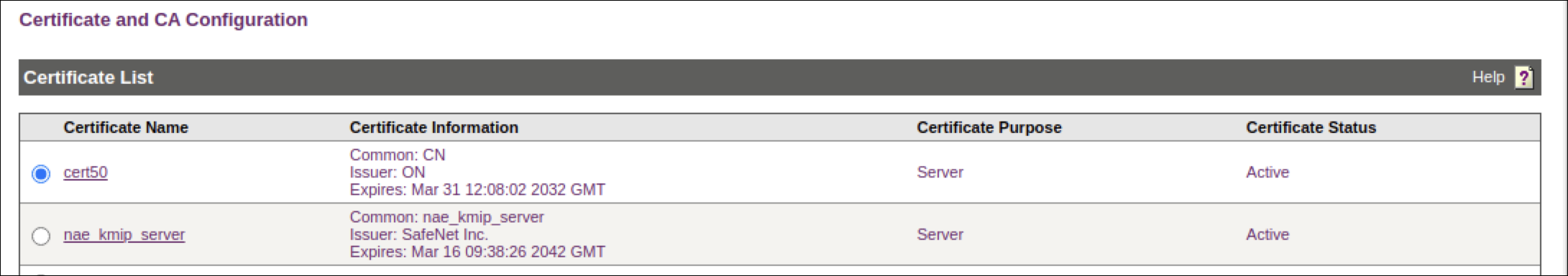 The Management Console takes you to the Certificate List section. The section shows that the Certificate Purpose is Server and that the Certificate Status is Active.