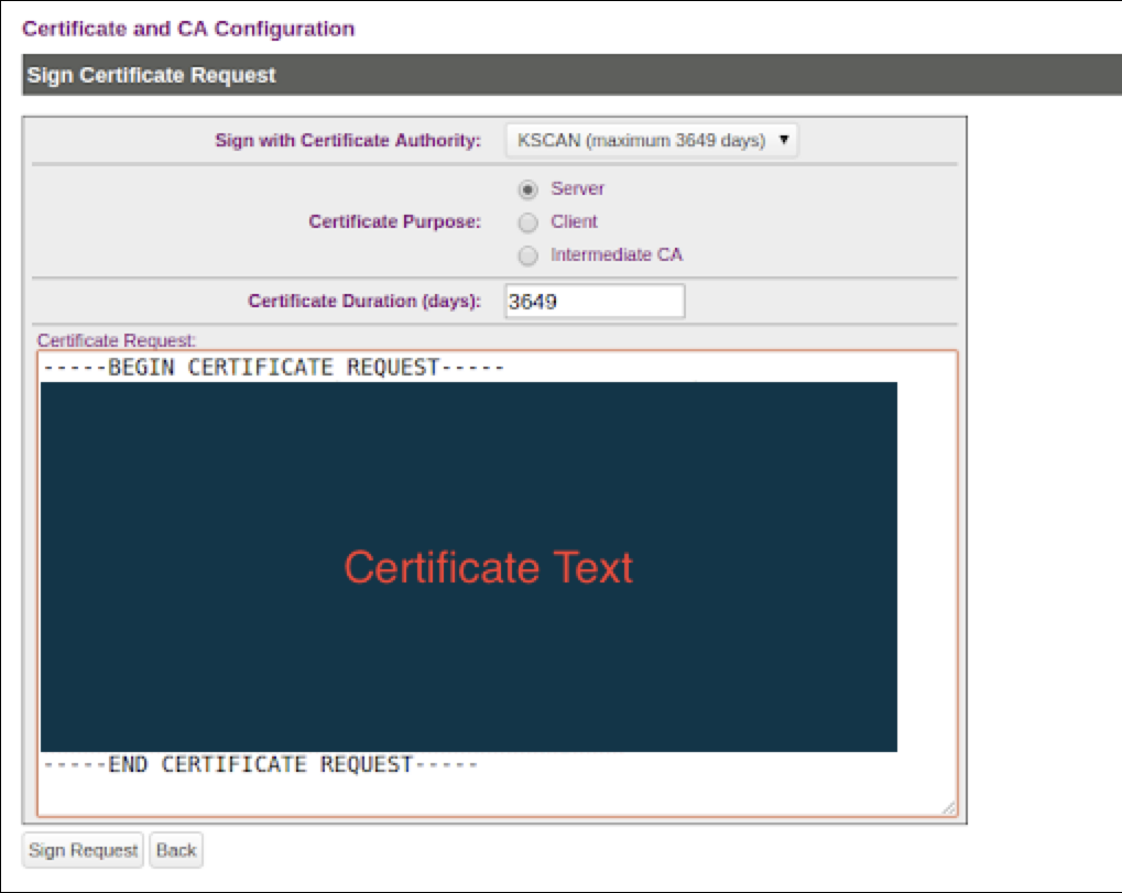 - On the Sign Certificate Request screen, select Server as certificate Purpose.