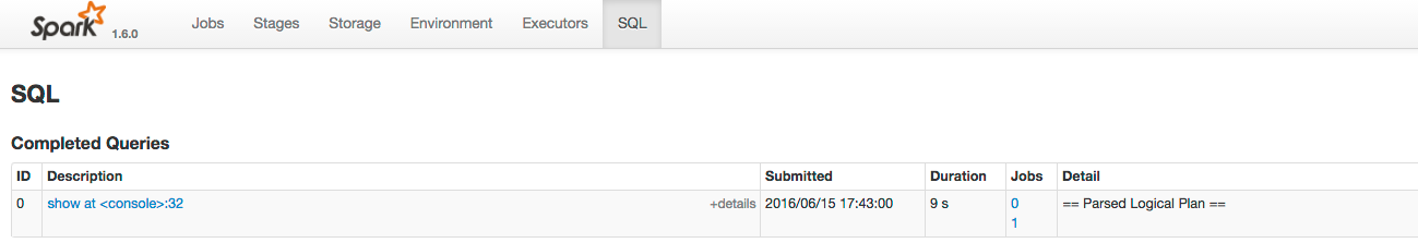 In addition to the screens described above, the web application UI of an application that uses the Spark SQL API also has an SQL tab. Consider an application that loads the contents of two tables into a pair of DataFrames, joins the tables, and then shows the result. After you click the application ID, the SQL tab displays the final action in the query: