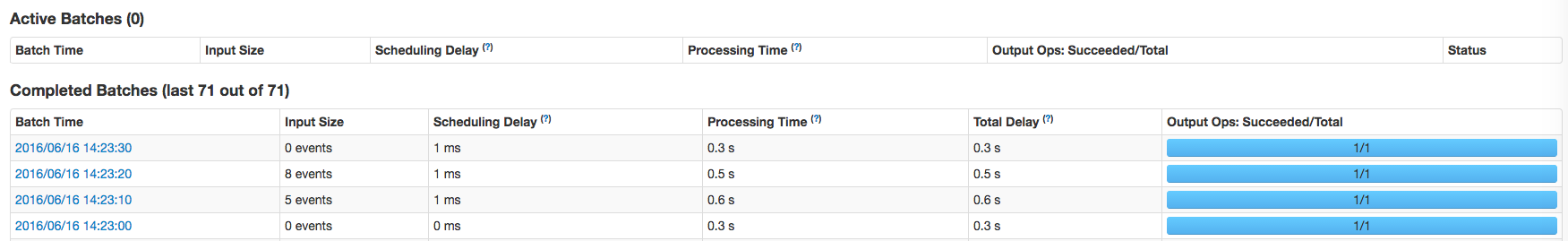 To view the details of a specific batch, click a link in the Batch Time column. Clicking the 2016/06/16 14:23:20 link with 8 events in the batch, provides the following details: