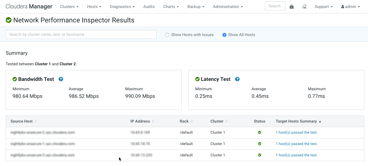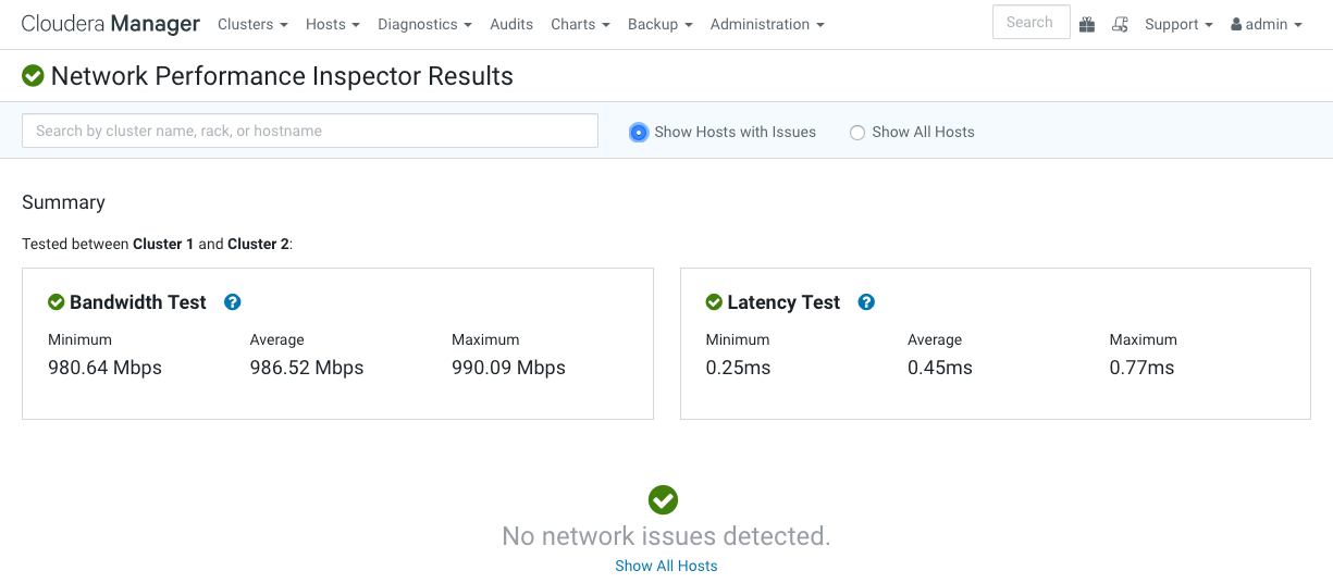 The Network Performance Inspector allows you to examine the network performance among hosts and clusters managed by an instance of Cloudera Manager. You can use this tool to diagnose networking issues that can significantly affect the performance of workloads such as MapReduce jobs, Spark jobs, Hive queries, and Impala queries, particularly when using remote storage. You can run the inspector on-demand, and it also available when adding a new cluster. You can also run the inspector using the Cloudera Manager API.