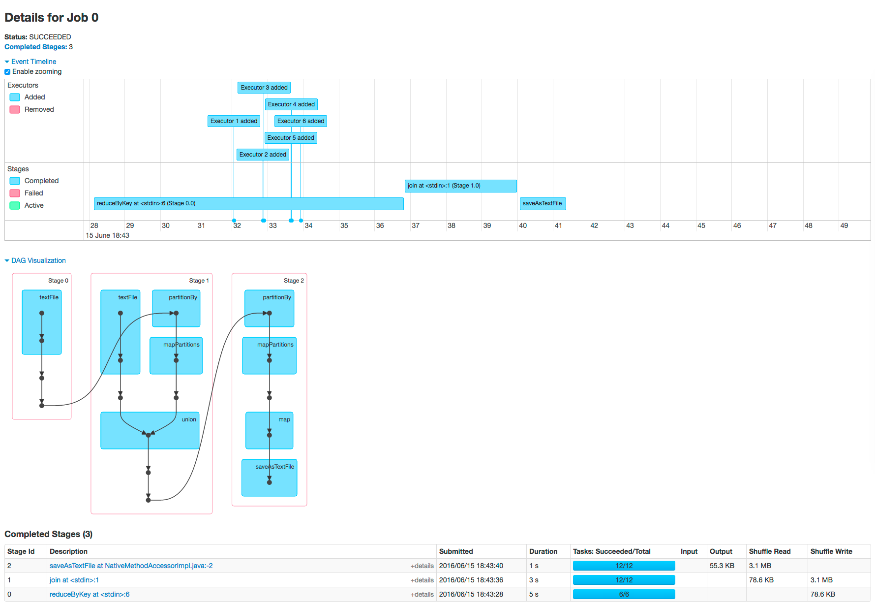 executors. Each job shows the last action, saveAsTextFile, run for the job. The timeline shows that the application