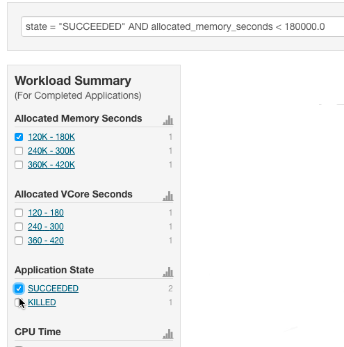section. See the Attributes table.The attributes display in the Workload Summary section along with values or ranges of values that you can filter on. The values and ranges display as links with checkboxes. Select one or more checkboxes to add the range or value to the query. Click a link to run a query on that value or range. For example: