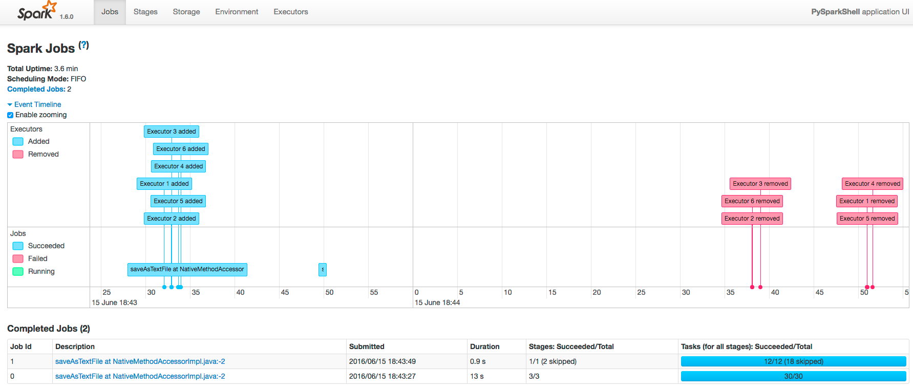 executors. Each job shows the last action, saveAsTextFile, run for the job. The timeline shows that the application